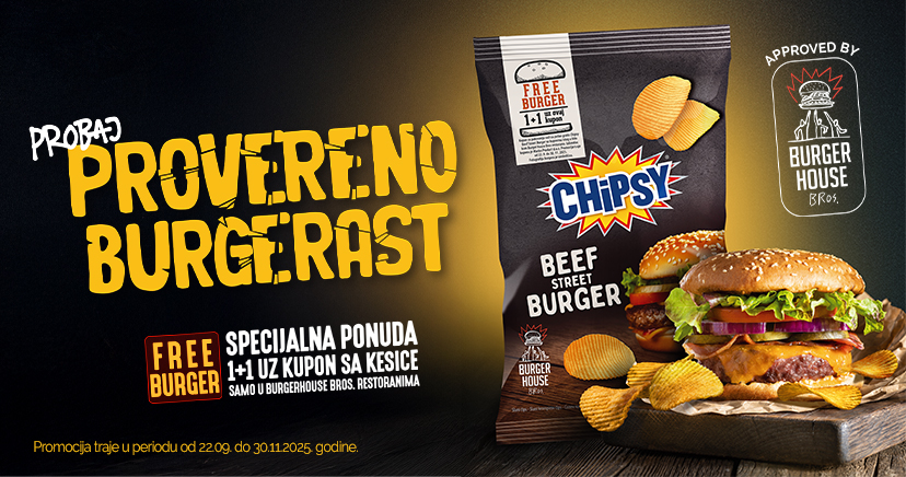 Udružili smo snage sa Burger House Bros i stvorili burger kakav do sada nisi probao – Chipsy Beef Street Burger! Isečeš kupon sa kesice, poručiš jedan Chipsy Beef Street Burger u bilo kom Burger House Bros restoranu i drugi dobiješ gratis!