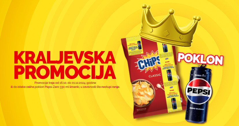 Obaveštavamo vas da je "Chipsy kraljevska promocija" završena 31.12.2024. Ovom prilikom se zahvaljujemo na izuzetnom interesovanju za naše aktivnosti! Zamenske kupone sa kesica obeleženih promotivnom trakom više nije moguće zameniti za gratis Pepsi Zero 330ml limenke na obeleženim prodajnim mestima.