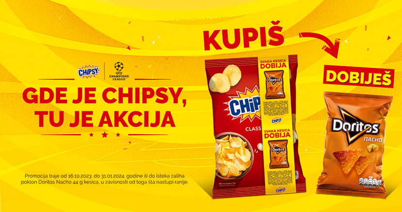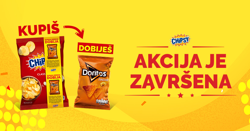 Obaveštavamo vas da je promocija “CHIPSY - Svaka kesica dobija” završena. Ovom prilikom se zahvaljujemo na izuzetnom interesovanju za naše aktivnosti! Zamenske kupone iz kesica obeleženih promotivnom trakom više nije moguće zameniti za gratis Doritos Nacho 44g kesice na obeleženim prodajnim mestima.